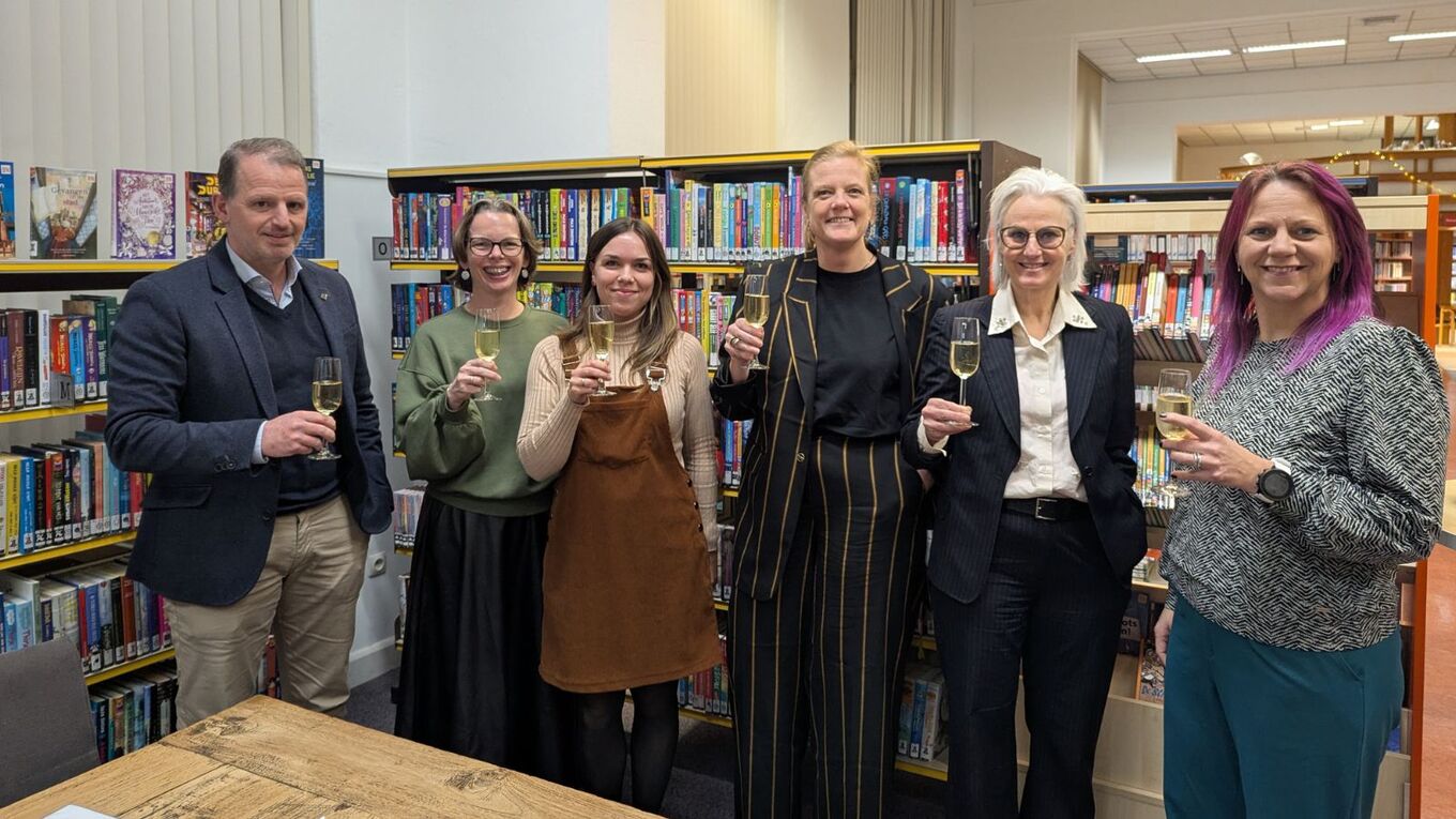 Op de foto (vlnr): Philip Loots (burgemeester Baarle-Hertog), Marjolijn Schuurmans (regiomanager Theek 5), Irina Peeters (bibliothecaris Baarle-Hertog), Sophieke Verhoeven (schepen Baarle-Hertog), Heidi Buijtels (directeur-bestuurder Theek 5), Janneke van de Laak (wethouder Baarle-Nassau)