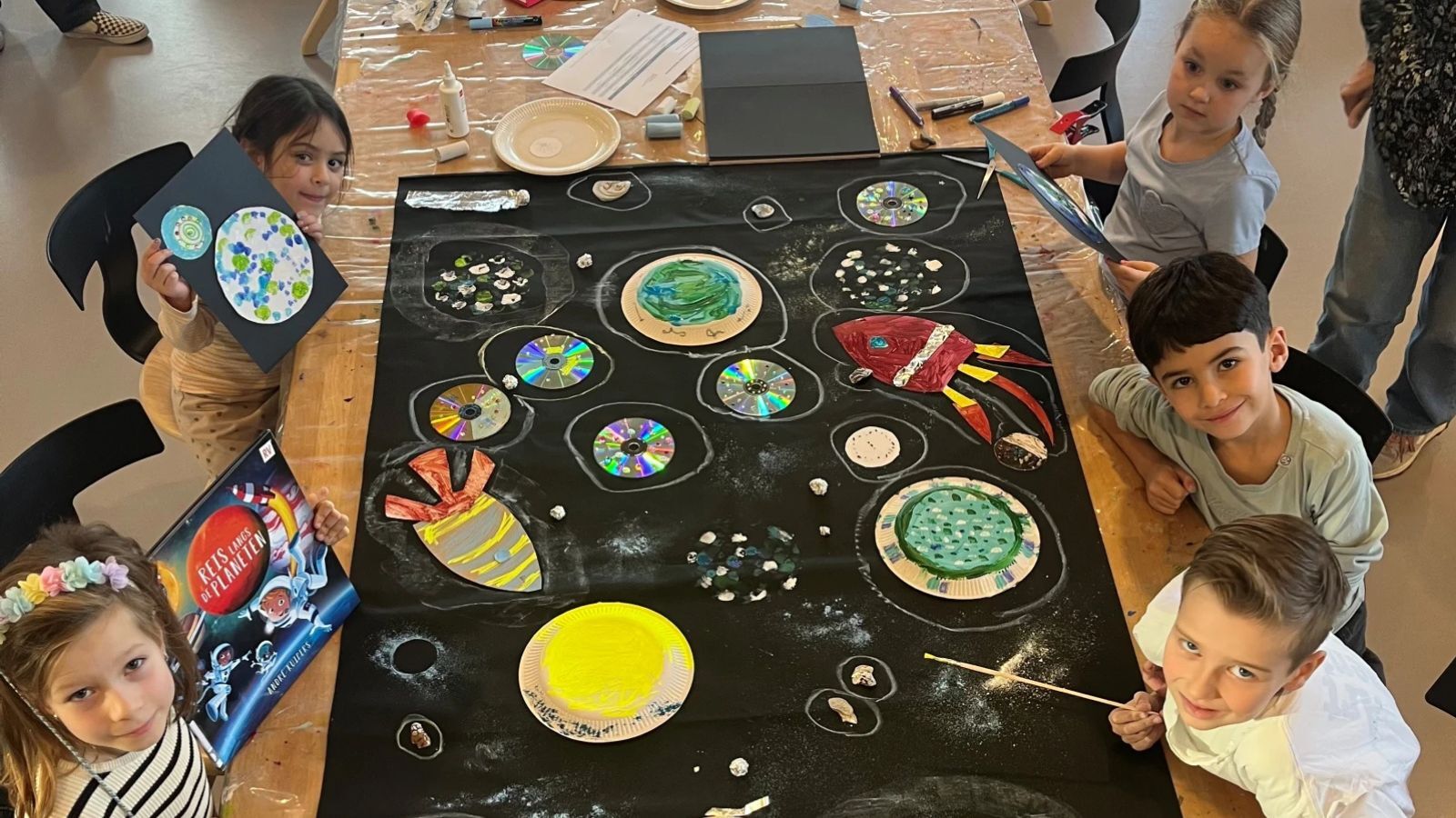 beeld v.l.n.r.: Tess (7 jaar), Zarah (5 jaar), Ties (7 jaar), Enes (5 jaar) en Josje (4 jaar) tonen trots hun zelfgemaakte ruimtekunstwerk, geïnspireerd op het prentenboek ‘Reis langs de planeten’ van André Kuipers.